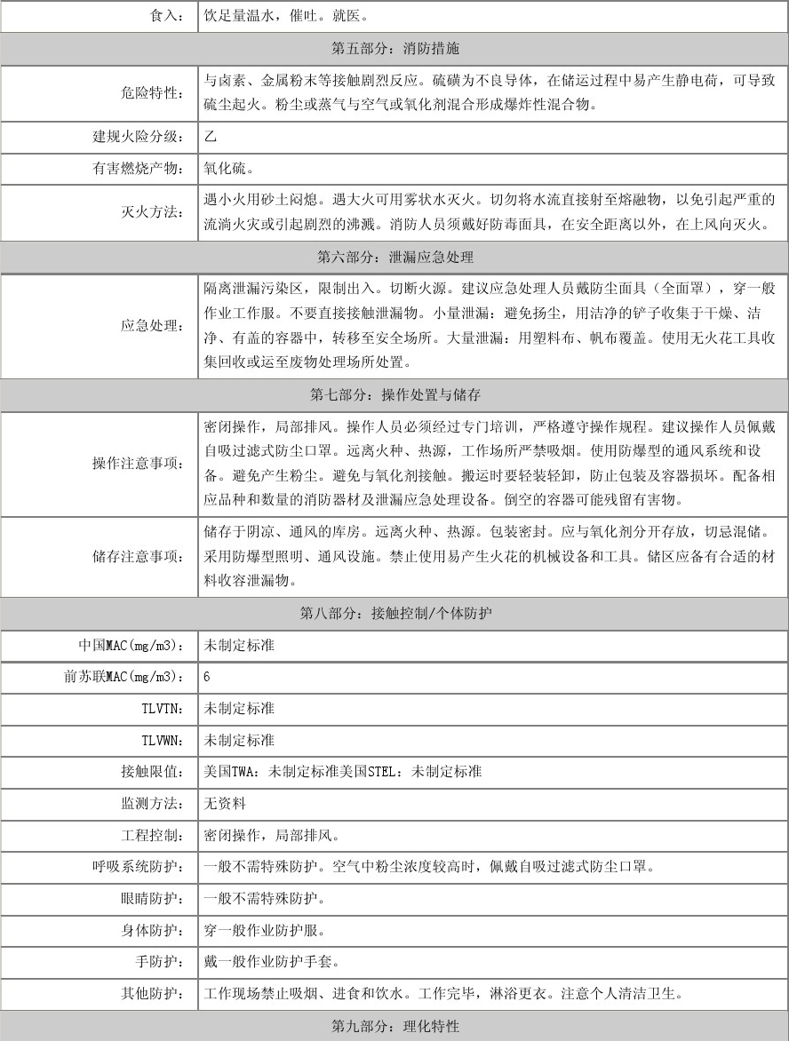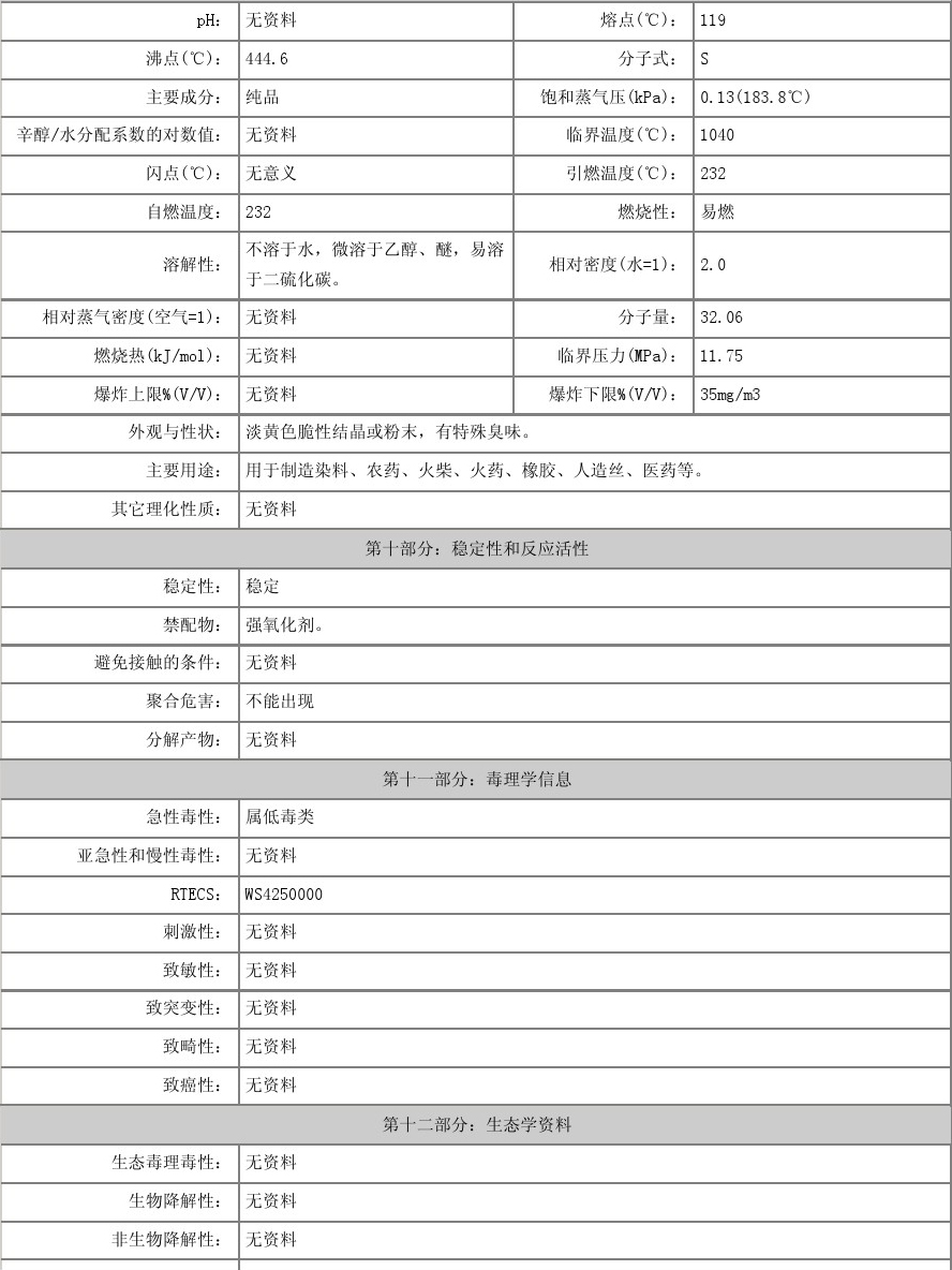 物化性質:性狀 粉狀硫黃為淡黃色粉末。熔點112.8℃沸點444.6℃相對密度2.07溶解性 易溶于二硫化碳,不溶于水,略溶于乙醇和醚類。